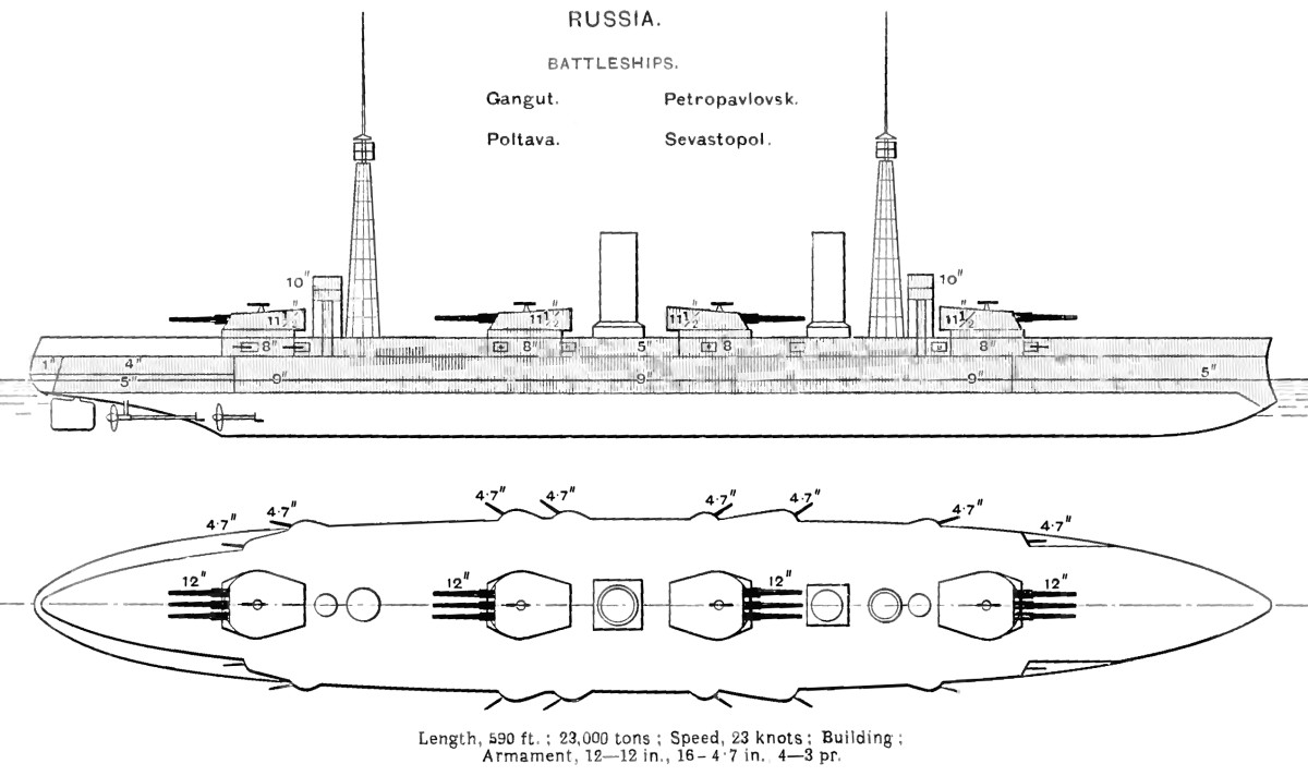 The Russo-Japanese War left the Russians with a deep appreciation of the power of the high explosive shell, which left the Ganguts with an armor scheme optimized for a very different threat from that faced by the all-or-nothing armor schemes the US adopted a few years later. The ship was armored throughout against HE fire, which meant a thin belt, only 9". The belt was backed by a series of 2" splinter bulkheads designed to capture the broken shells. It would probably have been effective against the AP shells available at the time the ships were designed, but the improved post-Jutland shells would have penetrated fairly easily. 3"-5" plating was used across much of the rest of the hull. The protection for the armament was pretty lacking, with 6" barbettes and 8" turret faces and sides. The upper deck was 1.5", with a main deck of 1". All in all, it was an intelligent system for the conditions the Russians expected to face at the time, although it probably wouldn't have worked very well if they'd seen combat later in their careers.