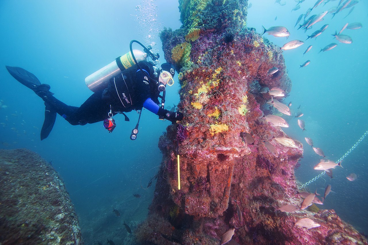 Neat stuff: Fish in more sizes, shapes, and colors than you thought possible. Also rays, eels, and sharks large and small. The multitude of invertebrates crawling on the sea floor do nothing for me, but other people find them fascinating (and even I have to admit the occasional octopus is kind of cool). Coral reefs and kelp forests. An eerie landscape of sand and rock in exotic forms, often crusted in marine life. Shipwrecks if you know where to find them, and many of the better ones are mapped. Even a couple of battleships and aircraft carriers, though they’ll require more advanced training. Other underwater infrastructure; offshore oil rigs are interesting both for the engineering and the marine life that calls them home. And playful marine mammals, including but not limited to other divers.