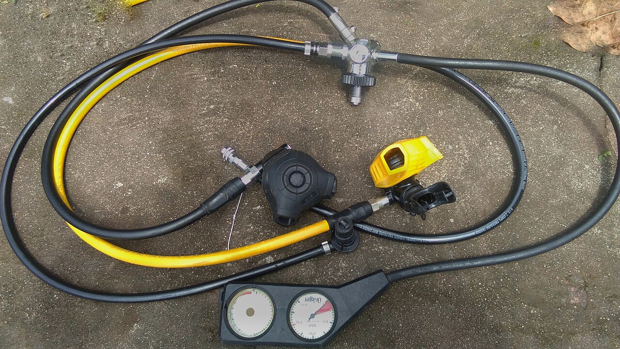 Third hose goes to the Buoyancy Control Device (BCD). This is basically the harness to which your other gear, especially the tank, is attached. The name comes from the fact that it includes inflatable bladders for adjusting buoyancy. These can be inflated by compressed air from your tanks or manually through a separate mouthpiece, and deflated through vent ports. We’ll talk more about buoyancy control in a bit, but the bottom line is that you don’t want to depend too much on your BCD for that. And it isn’t strictly necessary at all; in olden times divers didn’t have BCDs, and even now some divers just use a plain backplate harness to hold the tank. But a good BCD makes it easier.