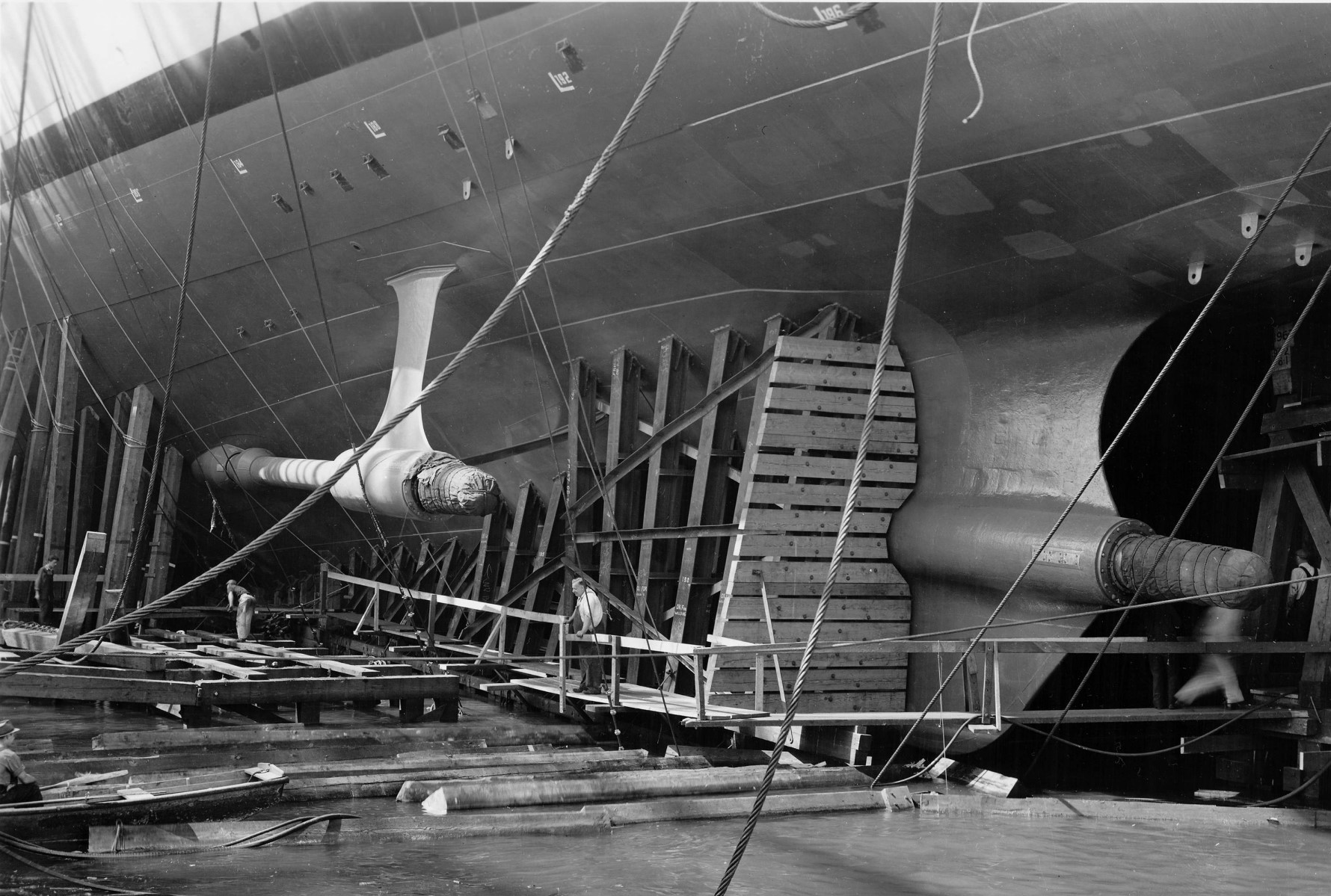 This was harder than it sounds. A careful balance had to be struck between making sure that the hull didn't hang up on the launching ways, the concrete tracks that it was built on, and making sure that it didn't go into the water so fast that it got damaged or ran into the opposite bank, a particular problem for yards on narrow rivers. Possibly the most fraught part of the process was when the ship left the ways, which didn't extend very far below the surface of the water. If the stern of the ship wasn't buoyant enough when the center of gravity passed the end of the ways, the bow would tip up, which was unlikely to end well. If things went well, the loads would instead be concentrated on the bow as the stern started to float, which meant that the launching cradle, the ways, and the bow itself all had to be specially reinforced.