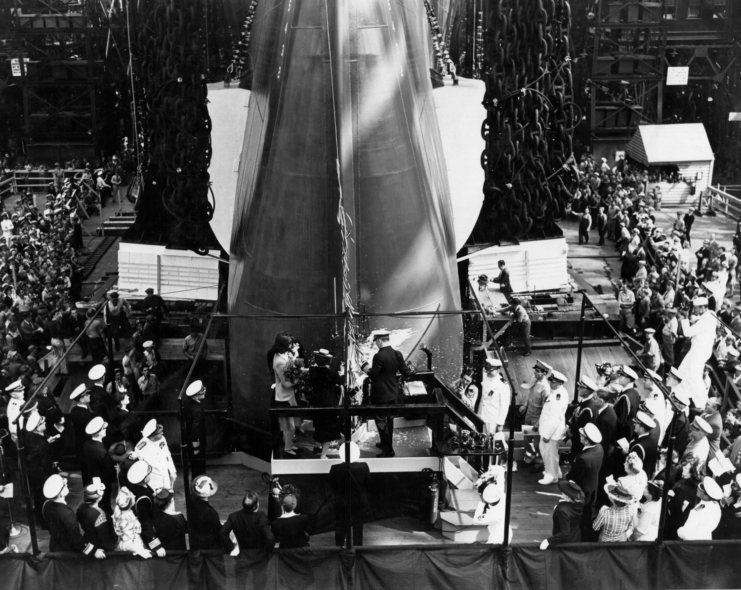 At last, it was time for the ship to enter the water. The sponsor would swing the bottle and name the ship, traditionally followed by "May God bless her and all who sail in her." A crew nearby would throw a trigger, releasing the ship, which would hopefully begin to slide down the ways. This occasionally didn't happen, the most famous incident probably being the launch of the frigate Oliver Hazard Perry, when the ship refused to move for several minutes due to grit in the grease, and finally began to go just as John Wayne, who was at the launch, appeared to give the ship a push.