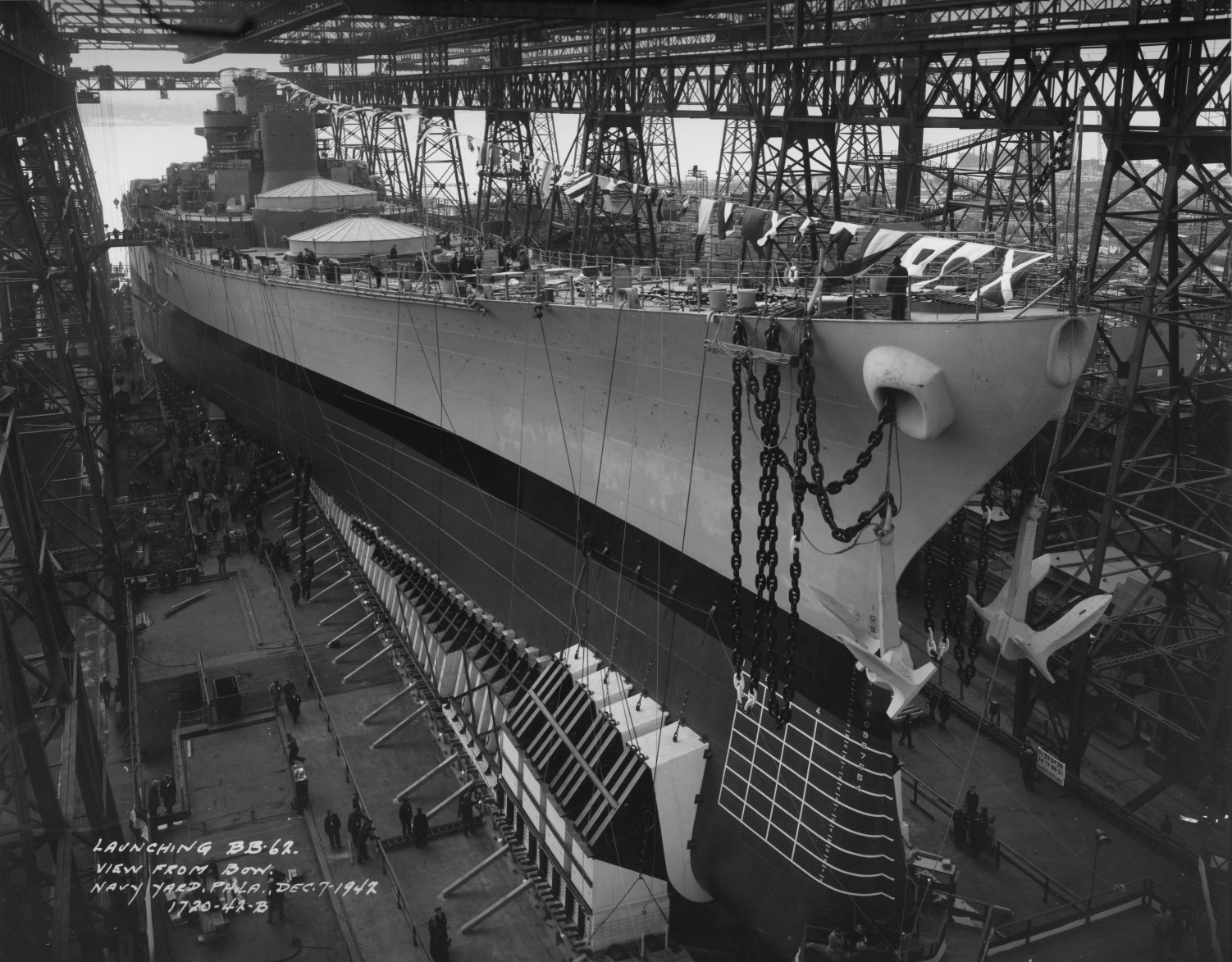 Iowa shortly before launch. Note the chains, carried to slow the ship after she entered the water, and the forward poppet.