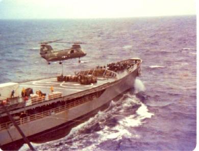 It would arrive either by a manila highline between ships, or helicopters would carry slings of it and drop it off on our helo deck on the bow. Then groups of us would run forward and manhandle the crates aft to be stowed on deck.