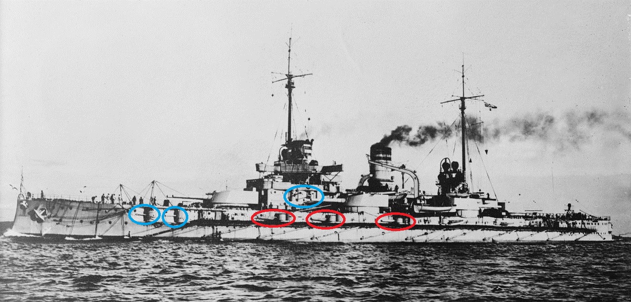 SMS Westfalen of the Nassau class, showing 5.9" (red) and 8.8cm (blue) secondaries