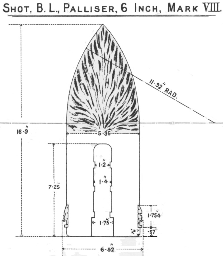 Shot also saw development during this period, most notably the development of a chilled cast-iron shot by Major William Palliser. The so-called Palliser shot was cast into a special mold where the head was chilled to make it harder while the body was cooled more slowly to give toughness, giving good performance against wrought-iron armor. Some versions, known as Palliser shells, were filled with powder, which was simply set off by the impact, although effectiveness was still limited because it detonated outside of the armor.5 However, improvements in armor soon began to render Palliser shot obsolete. It stayed in inventory for several decades because it was very cheap compared to later armor-piercing projectiles.6
