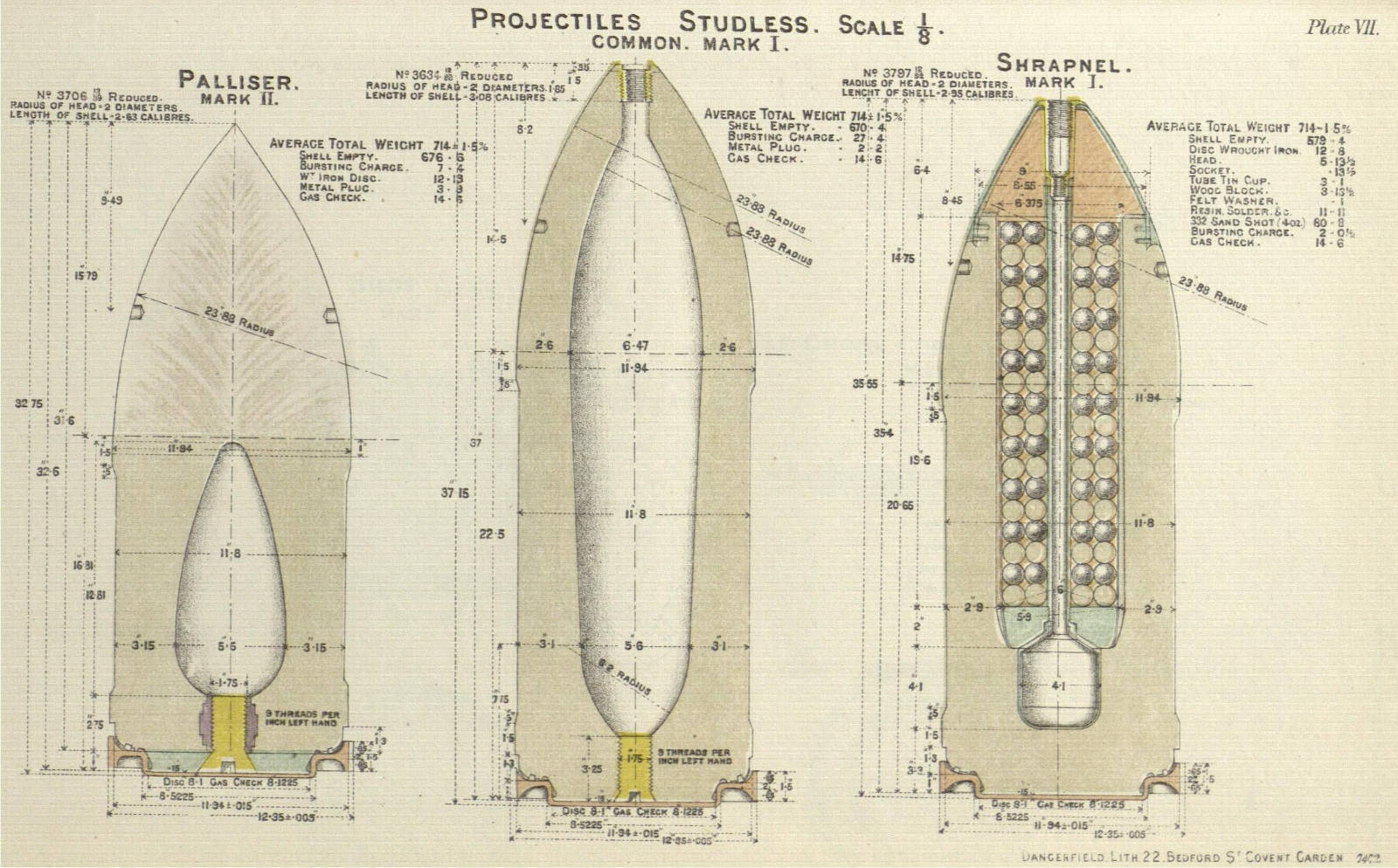 4 "Common" was probably meant to contrast with the other type of shell at the time, shrapnel. This was essentially a canister full of metal balls, with a bursting charge that would scatter them. If the time fuze was set right, this would be right over the enemy. I'm not going to go into more detail, as shrapnel was rarely used at sea, even though it was provided for many naval guns, which were also used on land. ⇑