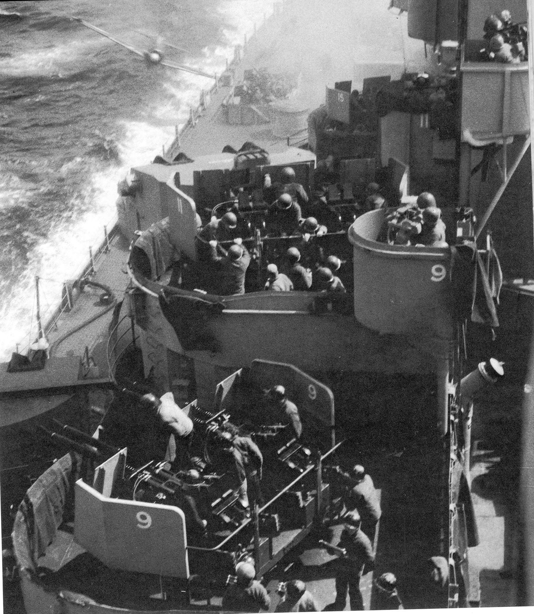 As March drew to a close, the US marshaled forces to invade Okinawa, and Missouri was first tasked with participating in a diversionary bombardment, and broke in her main guns by sending 180 rounds at Japanese positions. After the troops began going ashore on April 1st, the Japanese air attacks intensified. On the 11th, it was Missouri's turn. A Zero crashed into her amidships on the starboard side. Fortunately, the bomb it was carrying didn't go off, but some of the plane's gasoline ignited. The fire was swiftly put out, but not before smoke was drawn into some of the engineering spaces, forcing the crew below into gas masks.