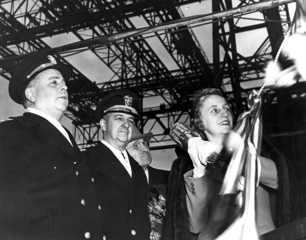 3 It's traditional to have a female sponsor responsible for christening the ship on launching, and who often then serves as an informal patron to the ship. This honor was usually offered to the Governor's wife or daughter, but the Governor of Missouri at the time was a Republican, while Truman was the head of an eponymous committee charged with fighting waste and inefficiency in the war effort, so the Navy Department took the chance to gain his favor. ⇑
