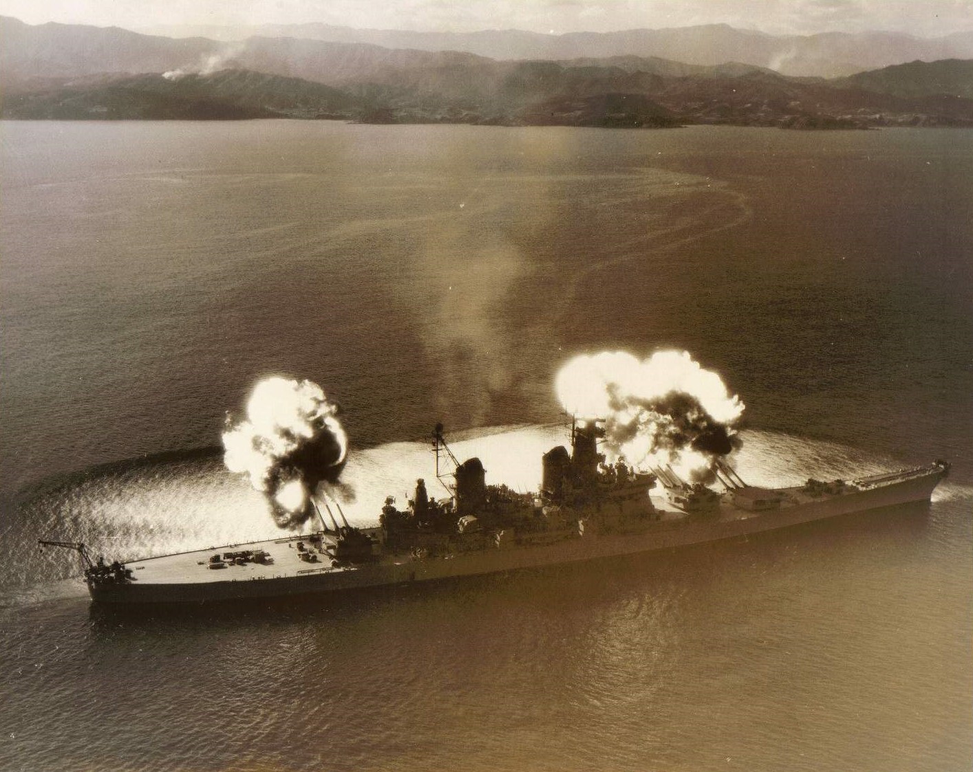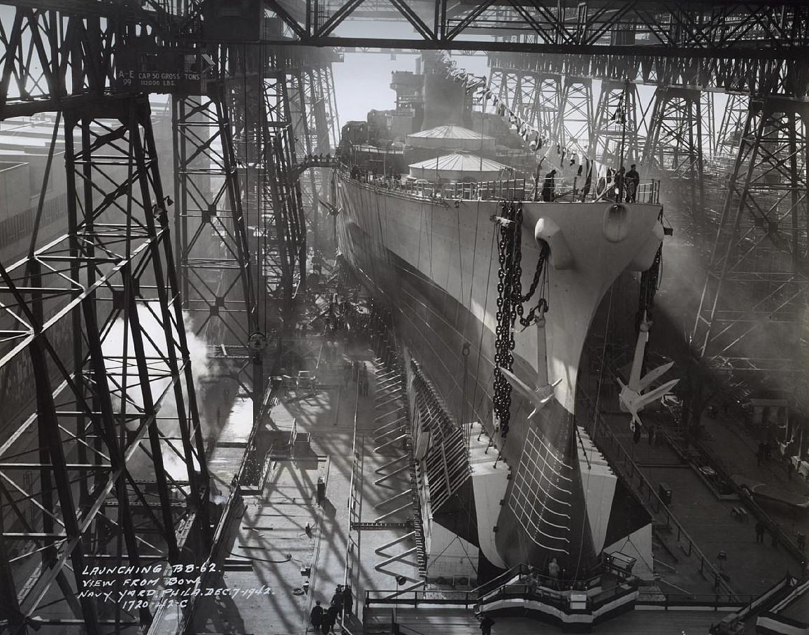 New Jersey was ordered at the same time as Iowa, from Philadelphia Naval Shipyard. Launched on December 7th, 1942, and commissioned on May 23rd, 1943, she spent the next 6 months working up in the Atlantic. On January 7th, 1944, she, in company with Iowa, passed through the Panama Canal, and into the Pacific. The two ships stayed together when they joined the Fifth Fleet, where Admiral Spruance chose New Jersey as his flagship. He was aboard her during the sweep around Truk, and kept his flag aboard until mid-April, including the bombardment of Milli.