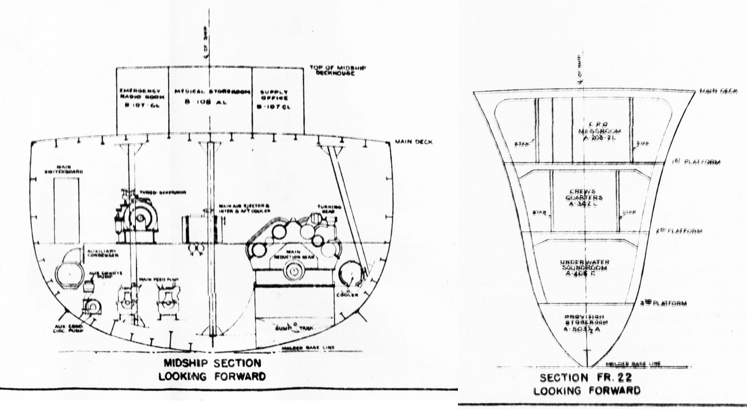 Sections of a Fletcher class destroyer, showing longitudinal framing amidships (left) and transverse framing forward (right)