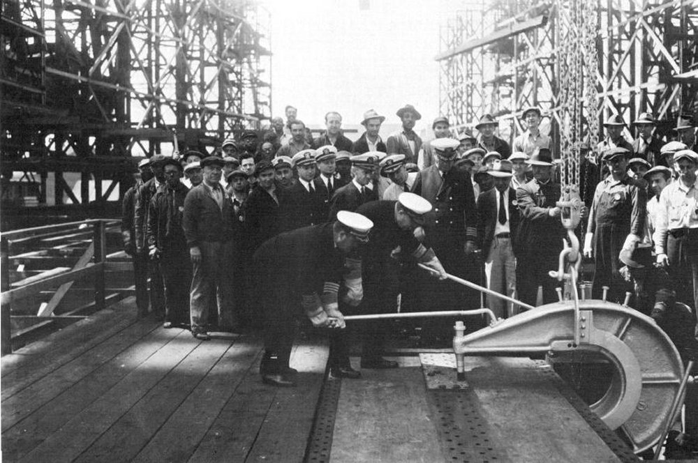 Iowa's keel being laid by Admiral C. H. Woodward, Chief of the Bureau of Construction and Repair