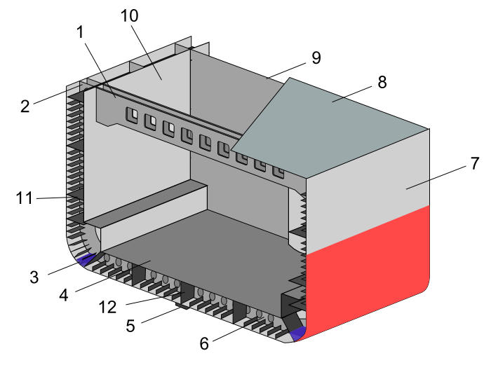 A longitudinally-framed ship. 1. Beam 2. Frame 3. Bilge 4. Inner bottom 5. Keel 6. Outer bottom 7. Shell plating 8. Deck 9. Bulkhead 10. Inner hull plating 11. Stringer 12. Keel vertical plate