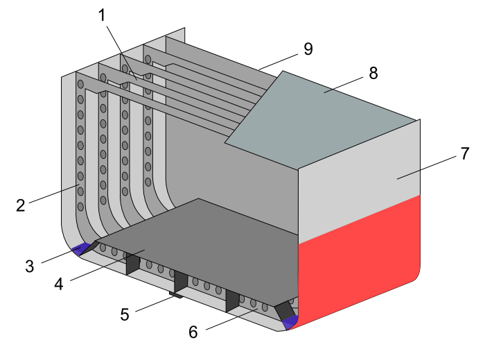 A transversely-framed ship. 1. Beam 2. Frame 3. Bilge 4. Inner Bottom 5. Keel 6. Outer bottom 7. Shell plating 8. Deck plating 9. Bulkhead