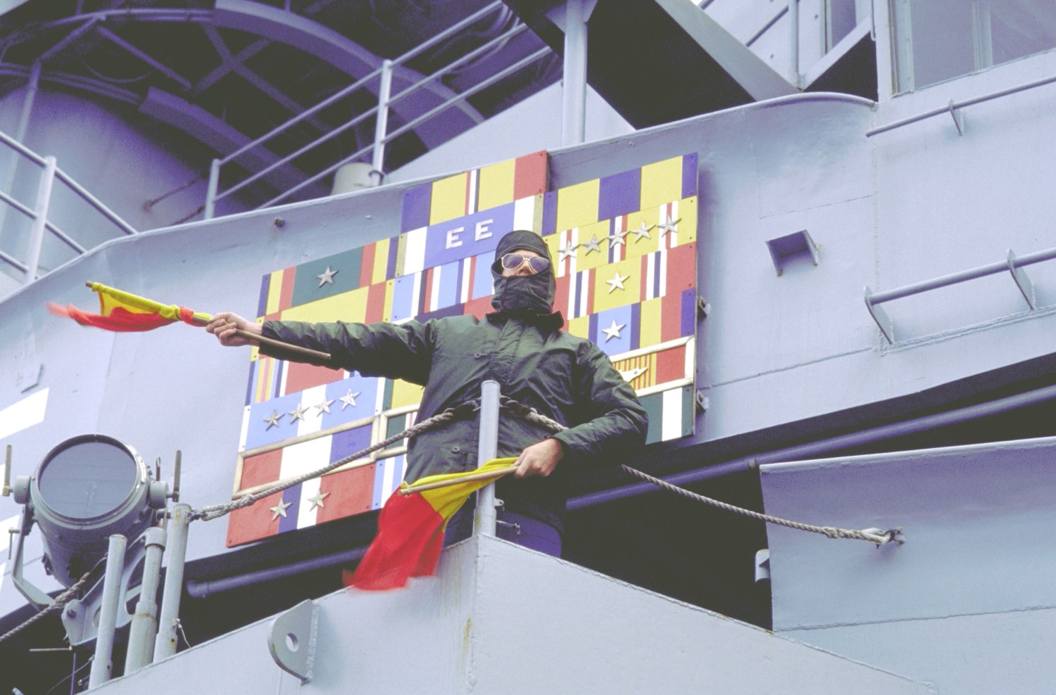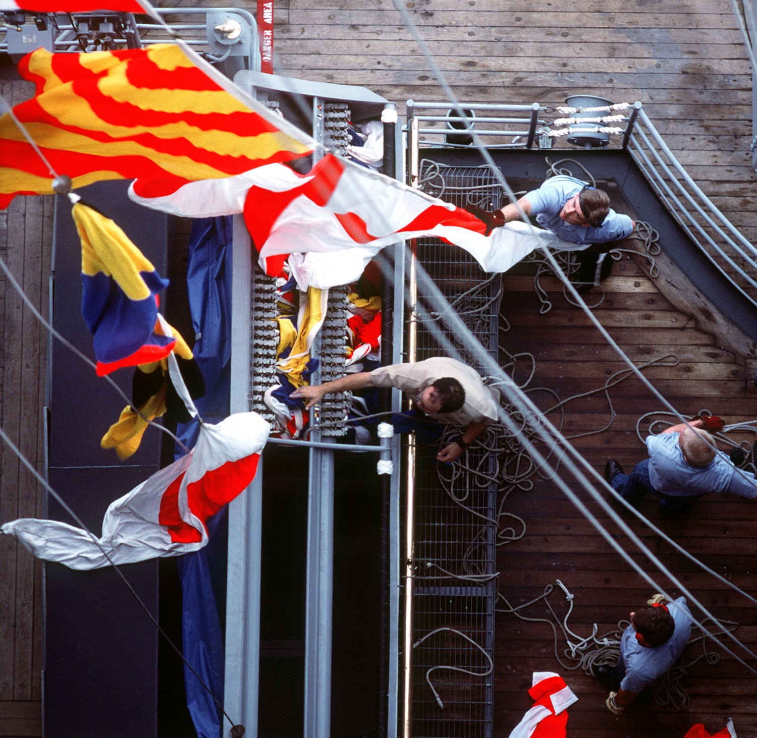 The first recorded naval signal came during the Battle of Salamis, when an oar with a red flag attached was raised from the Greek flagship as a signal to stop luring the Persians deeper and instead launch the attack, which ultimately scattered the Persians and turned back Xerxes' invasion of Greece.1 And this set the pattern for operational signals for most of the next two millennia. The commander of a fleet would set up specific signals to support his plan, maybe declaring that a blue flag meant "attack the enemy" while a red flag meant "withdraw". Over time, some of these signals became traditional, and certain banners would be flown when a ship sighted the enemy, or when an admiral wanted his captains to come to the flagship for a conference. Sails were often used for signals, too, with the flagship letting fly the fore topsail being the traditional signal for the fleet to prepare to get underway.