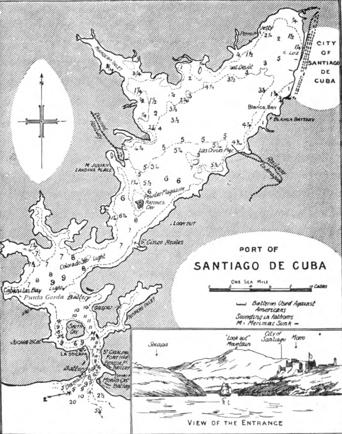 The next day, Admiral William Sampson, the overall American naval commander, arrived off Santiago and took command of the blockade. He found a harbor that would be extremely difficult to assault, despite the meager defenses, which included only four modern guns. Santiago sat on an inland bay, with a narrow, winding entrance. Ships would have to thread this passage under fire from guns mounted on the high, rocky walls, an extremely unpleasant prospect.