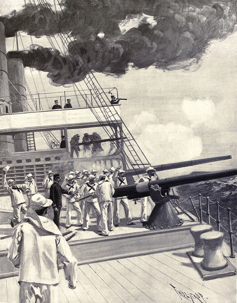 The next few days were quiet, but on the 6th, Sampson sent his ships in to bombard the forts. The three modern Spanish 6.3" guns were faced with eight 13", six 12", 38 8" and 24 6" guns, as well as numerous smaller weapons. But while the firepower of the attacking ships was indeed sufficient to drive the Spaniards from their guns, it was not enough to actually disable those guns, or prevent them from being manned again as soon as fire slackened. Several shells struck the unarmored cruiser Reina Mercedes, setting her on fire and mortally wounding her captain. Ultimately, the main effect was to boost Spanish morale, as they came to the conclusion that they had driven off a major American attack.