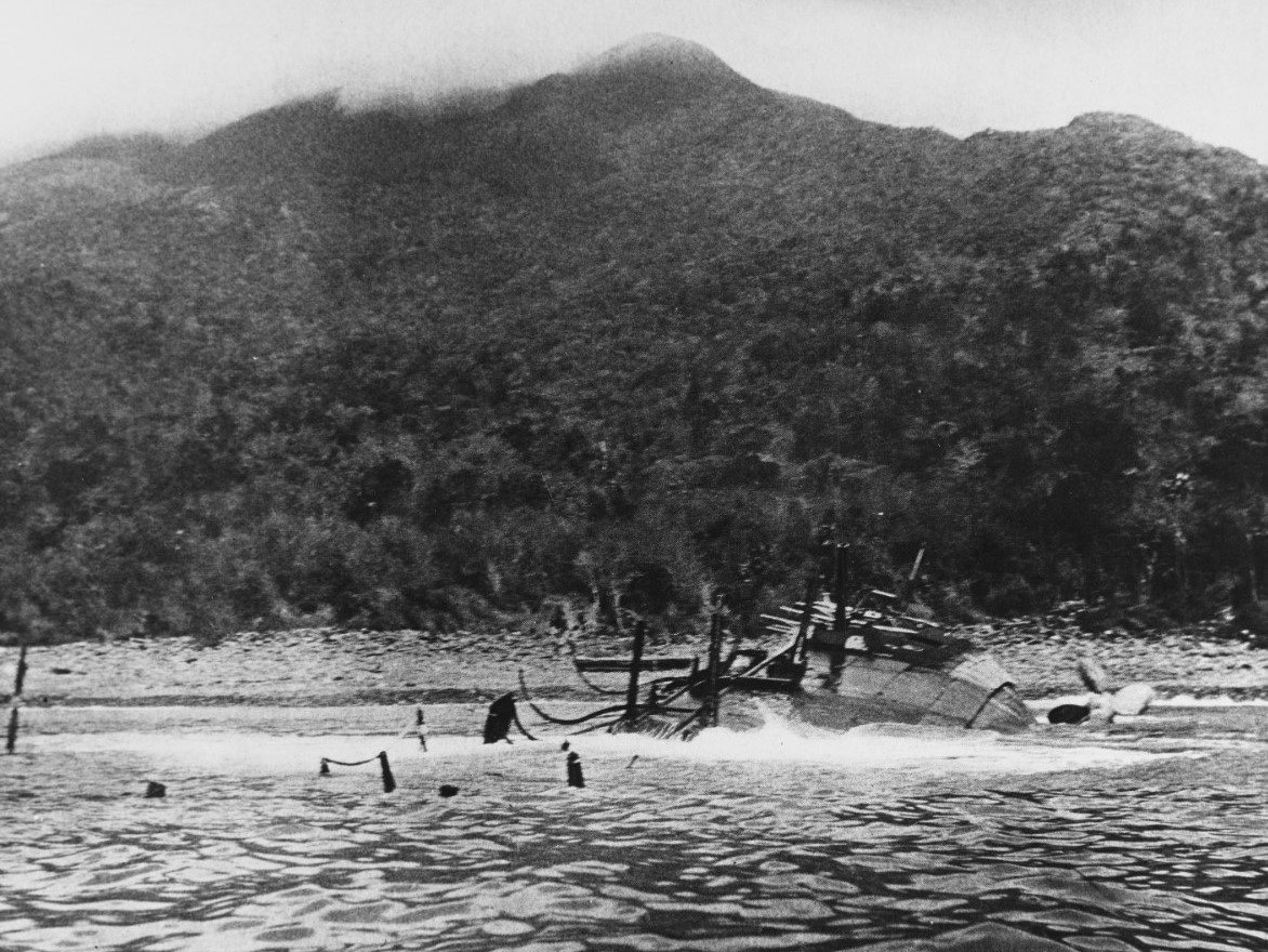 Colon's secondary guns point at the sky after her capsize