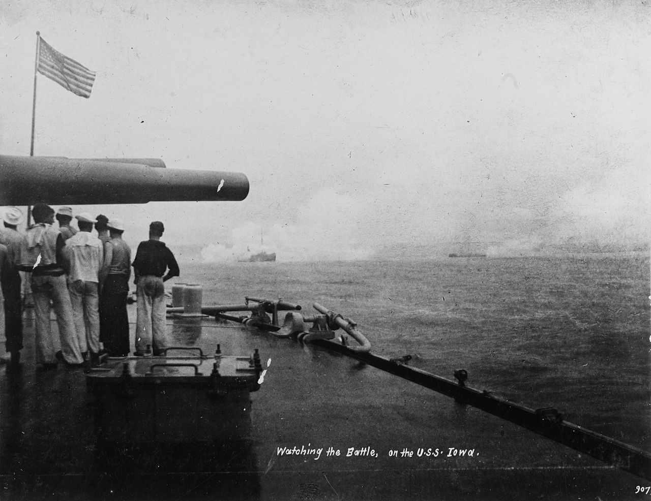 Men aboard Iowa watch the battle. Note the dense gunsmoke shrouding the ship in the center.