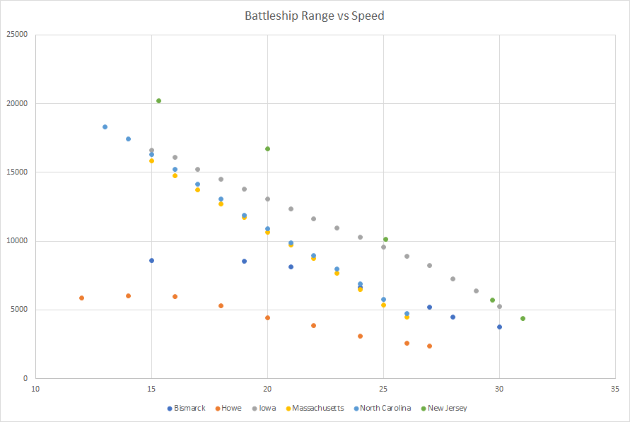 Can you expand on that? I could see hotel loads changing the slope of the curve some (and indeed we see this with Iowa v New Jersey) but the hotel load would need to be outrageously large for Iowa v Bismarck, and I would expect the Iowa curve to have about the biggest hotel load of any of the ships involved. Changes in the calorific value of the oil should just shift the curve up or down, again doing nothing to explain the different slopes, and the same is true of reserves.
