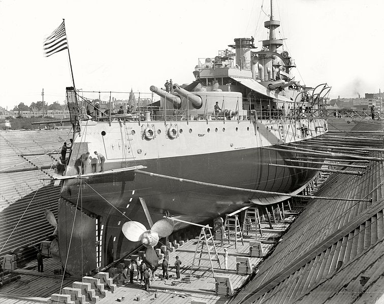 None of this discussion should lead you to believe that stability is the only factor in roll. While the roll period is set by the metacentric height and radius of gyration, the magnitude of roll is heavily influenced by the underwater hull form. For reasons beyond the scope of this post, some ships roll much more than others. The Royal Sovereign class were initially known as the "Rolling Ressies" because of the large angles they reached, but they were later refitted with bilge keels, which essentially damped the roll.3 Another interesting case is that of the German Nassau class. Their roll period happened to coincide with the average period of waves in the North Sea, and they rolled dangerously when they first entered service. Bilge keels were added, and the problem mostly went away.