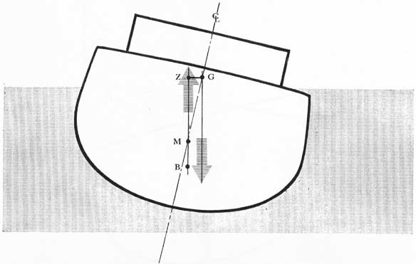 This property makes it easy to analyze stability. The most important metric is how high above the CG the MC is, known as metacentric height (GM). Righting arm can be approximated as GM*sin(roll angle), so that stability is directly proportional to GM. If the CG and MC were in the same place, GM is zero and there’s no restoring force if the ship rolls. If the metacentric height is negative, then the ship will loll, falling to one side until the CB moves enough to give a positive righting arm. This is very dangerous, and can quickly lead to the ship capsizing. Obviously, modifications which place weight high in the ship reduce GM by moving the CG upward.
