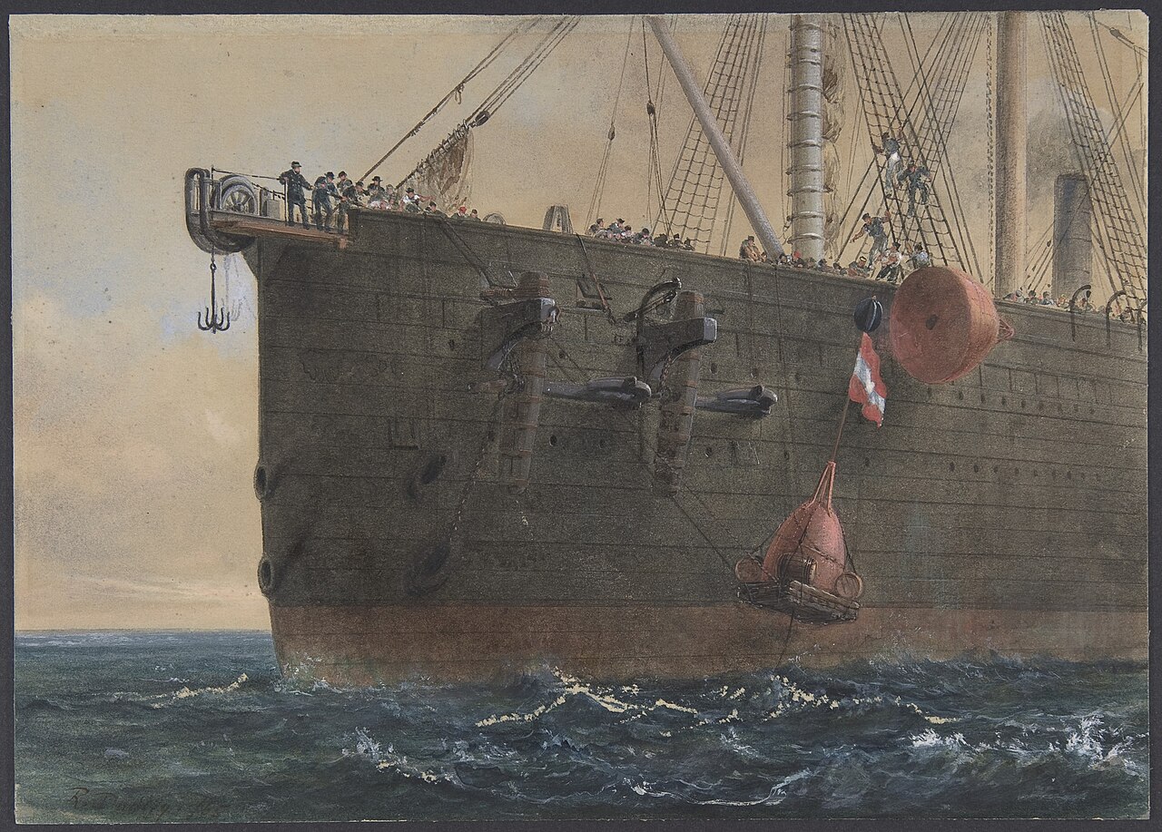 It was these measures which found the cause of the problem a few days later, when one of the watchers noticed a similar defect going through the rollers and into the sea. Unfortunately, it was too late to stop it, and the whole process of recovering the cable began for a third time. During the process, a worker noticed broken armoring wires on the tank underneath where the defect had rested, the brittle iron having snapped under the tremendous weight of the cable above. But in their haste, nobody remembered to tell Ireland what was going on, a decision that caused a great deal of consternation when the cable broke as it was being raised. By this point, Great Eastern was almost three-quarters of the way across the Atlantic, and the water below was at least 2,000 fathoms deep.3 Broken cable ends had been routinely retrieved in much shallower waters, but there were serious concerns about Great Eastern's ability to find the cable end over two miles below and bring it to the surface.