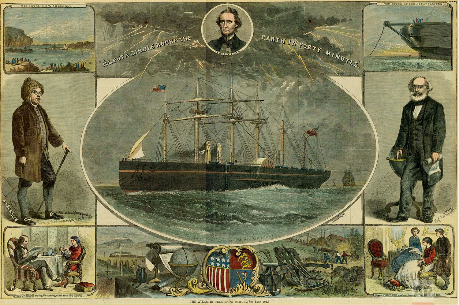 Back in Ireland, a small team had spent the last year monitoring the broken cable to ensure that it didn't develop new problems, and occasionally receiving "messages" from the deep, the result of geomagnetic fluctuations picked up by a thousand-mile antenna. But on that day, the message was clear. The cable had been wrested from the Atlantic, and Great Eastern would finish the job she had started the previous year. This time, her progress was eagerly followed on both sides of the Atlantic, reports back to Ireland being passed over the completed cable to those waiting in Newfoundland. Despite weathering a storm on the way, Great Eastern arrived at Heart's Content on September 7th, giving Field not one but two channels for messages between Europe and the Americas.