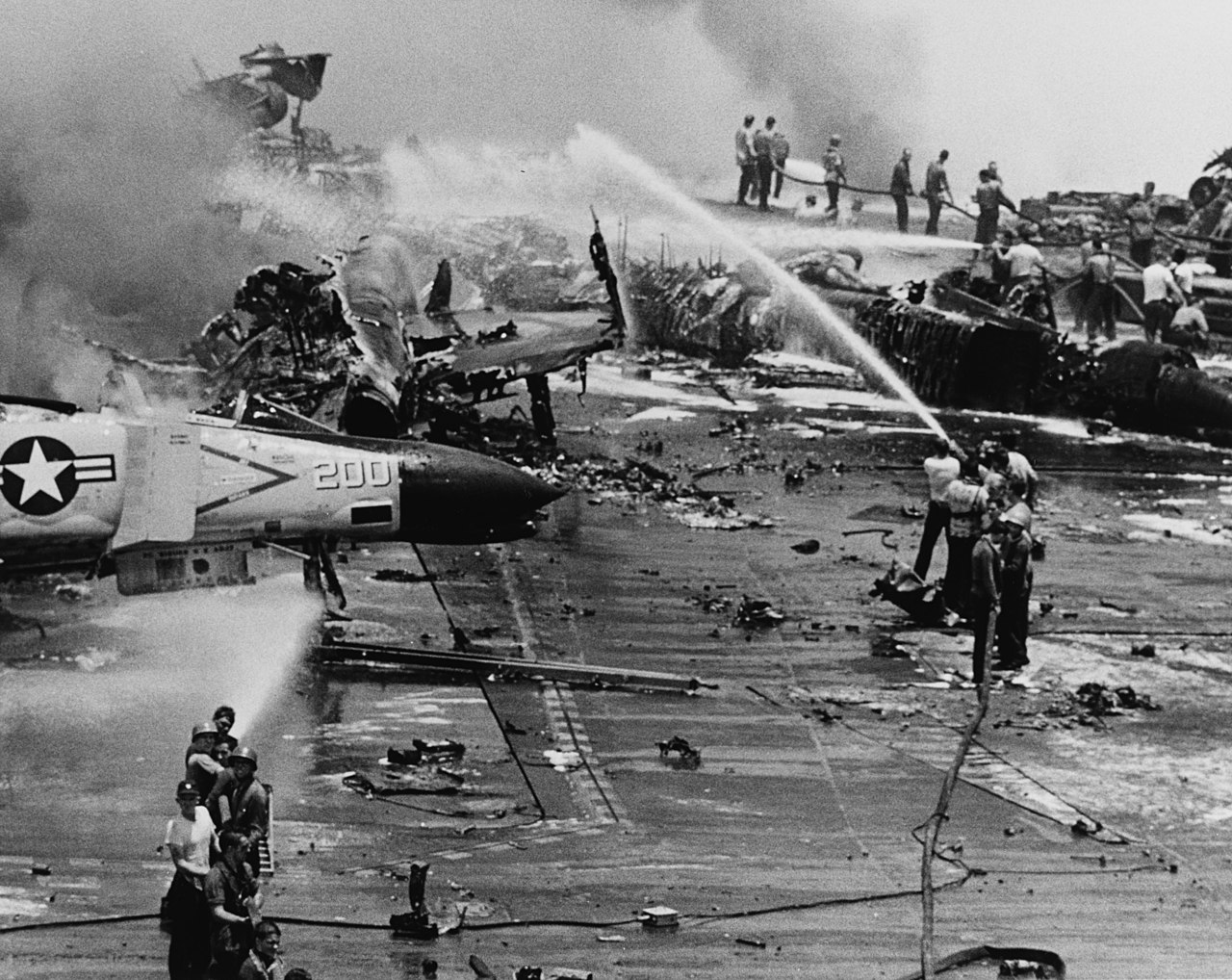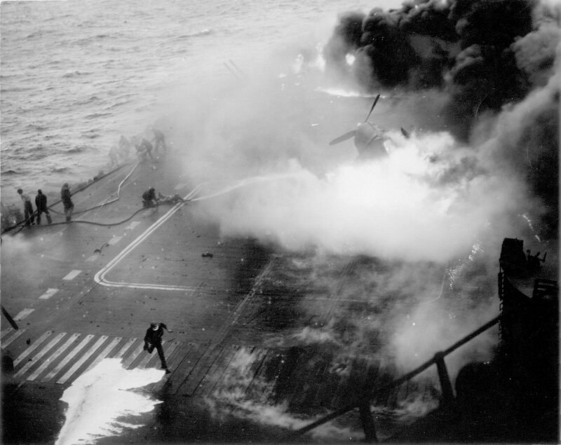4 There are a lot of carrier fire pictures for two reasons. First, carriers are incredibly flammable, due to the need to carry lots of volatile fuel and ordnance. Second, flight-deck fires are really easy to photograph compared to other kinds, and carriers have the spare hands to do so. ⇑