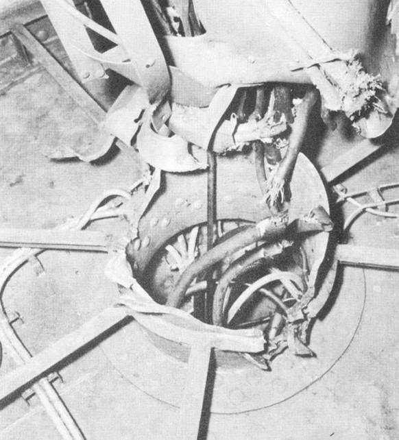 Of course, there are many ways to mission-kill a ship besides causing electrical problems, and several of these were demonstrated by Bismarck during her cruise. The shell hit from Prince of Wales after Hood's destruction contaminated a significant amount of fuel,6 and a later torpedo hit on her rudder from a Fairey Swordfish doomed the German ship. When the British finally caught up with her, her armor held up very well, but her combat-effectiveness was quickly destroyed by hits on the lightly-armored portions of the ship. The forward director was taken out by an 8" cruiser shell about 15 minutes into the engagement, and the aft director followed half an hour later. British shellfire soon riddled the conning tower and put the turrets out of action, but she remained under power and afloat for another hour. Surprisingly, Bismarck managed to avoid taking any shaft hits, but the exposed nature of the last part of the propulsion system was a definite vulnerability, even ignoring the propensity of bent shafts to form flooding paths.