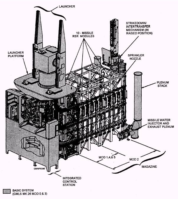 The last of the non-VLS systems was the Mk 26, used on the Virginia class CGNs, Kidd class DDGs and the first five units of the Ticonderoga class. It was a twin-arm Tartar-length system, although Tartar was long gone, and it only carried Standard, with each arm able to fire as fast as a Mk 13. It also had the capability to use ASROC, although apparently not Harpoon, and also the ability to carry nuclear-tipped weapons, which couldn't be used from the earlier Tartar launchers because of access concerns.4 These launchers marked a return to the "Coke machine" setup of the first Terrier launchers, with a modular design that allowed magazines of 24, 44 or 64 missiles. Ultimately, they were the end of the line, and were swiftly replaced by the Mk 41 Vertical Launch System, which could handle not only Standard and a new vertical launch version of ASROC, but also Tomahawk, transforming the mission of the surface warship as it gained the ability to strike far inland. But the history of VLS is a topic for another time.