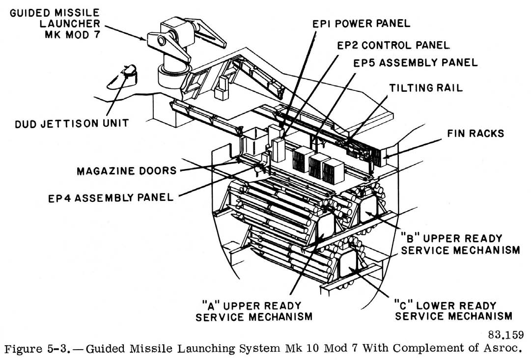 But Boston and Canberra were the only Terrier ships that carried their missiles vertically. The majority of ships used the Mk 10 launcher, which carried its missiles in a series of 20-round rotating rings. The most common version had three rings, two directly under the finning room and a third in the center below them that would pass missiles to either of the other rings to keep them topped up. From the finning room, which often doubled as the strikedown/checkout space, the missiles would be tilted upward to be rammed onto the launcher. The Mk 10 also introduced a new capability to the system, as half of the slots in the upper two rings could be occupied by ASROCs, which could be rammed and fired using an adapter that let them fit the rail. Afterwards, the adapter had to be withdrawn from the rail and sent back to the rings, but this was considered acceptable given that the system hopefully wouldn't have to engage air and subsurface targets at the same time.