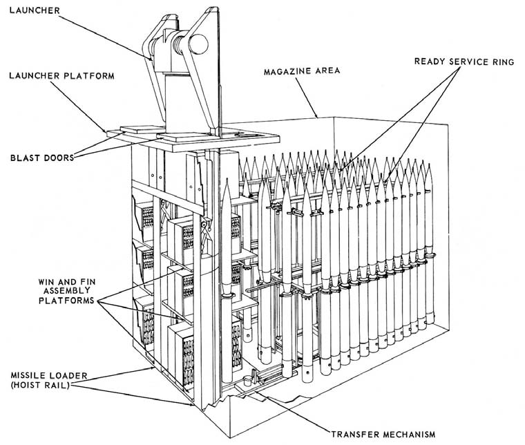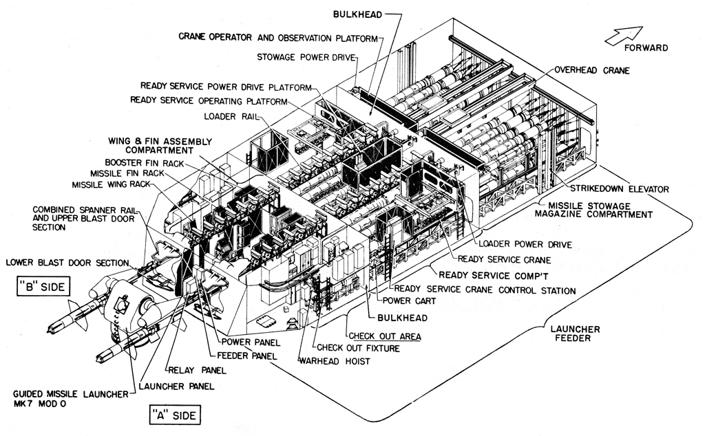 Talos was too large for a ring system, and the initial Mk 7 launcher, installed on the converted light cruisers Galveston, Oklahoma City and Little Rock, was quite primitive, with the entire system designed to go above the armored deck. The booster and missile were stored separately in racks in the magazine, 15 for each side, and lifted by crane for transfer to the forward ready service magazine where they were assembled and stored for use. Strikedown was done via overhead hatches into this area, with the missiles coming aboard via highline, and being moved via cart. Each side held 8 assembled missiles in a set of rotating trays, and they would be hoisted onto the rammer rail for transfer into the finning area. There, the crew would install the 12 fins required for each missile, with each man having a foot pedal to indicate that he was safely out of the way after his fins were installed. Then the blast doors would open, the rail would extend, and the missile would be rammed out onto the launcher. Outboard of the finning areas were the test cells, where each missile would be sent once a month to be checked out, a particularly annoying task if the required missile was at the bottom of the rack in the back magazine.3 Later Talos ships had the improved Mk 12, which stored the missiles fully-assembled in a below-decks magazine, up to 28 missiles per side, and using horizontal trays and an elevator, all could be accessed readily.