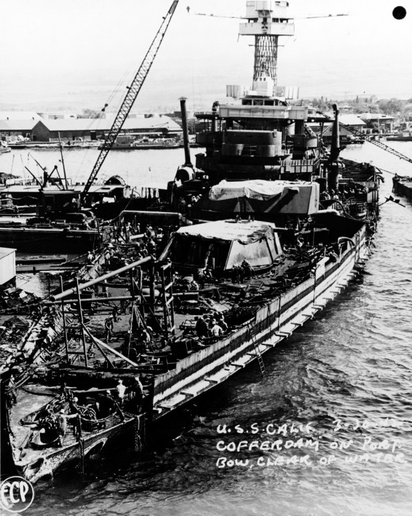 California was the next to be salvaged. She was in much worse shape than Nevada, and had to be extensively lightened. All of the guns (except those of Turret 4, which was underwater) and the conning tower and mainmast were removed. A cofferdam was built around the deck edge, essentially giving her extra freeboard, and all possible openings were sealed. Pumping then proceeded, gradually lowering the water level inside the ship, with removal of stores and bodies going on as more of the interior was exposed. Great care was taken to preserve her interior equipment, particularly electrical systems, the responsibility of a Commander Hyman G. Rickover, later to become famous as the man behind the Navy's nuclear reactors. She was refloated in late March and docked in April, undergoing additional repairs to structure and machinery until October, when she sailed for Puget Sound, receiving the same type of refit as Tennessee. She returned to the fleet in January 1944.