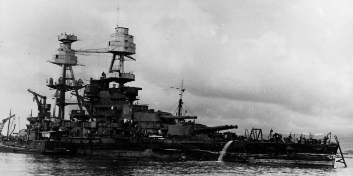 Oklahoma was the least valuable battleship at Pearl Harbor, due to her age and poor engines, and the decision was made to refloat and right her to clear the harbor, with no intention of returning her to service.2 The righting was done via building derricks on the hull and pulling on them with winches on Ford Island, a method called parbuckling,3 running March-June 1943. The hull was patched and refloated, then drydocked to strip her of anything valuable and make her seaworthy for the tow to the West Coast for scrapping. That tow, in May 1947, ended 500 miles from Hawaii when Oklahoma sank in a storm.