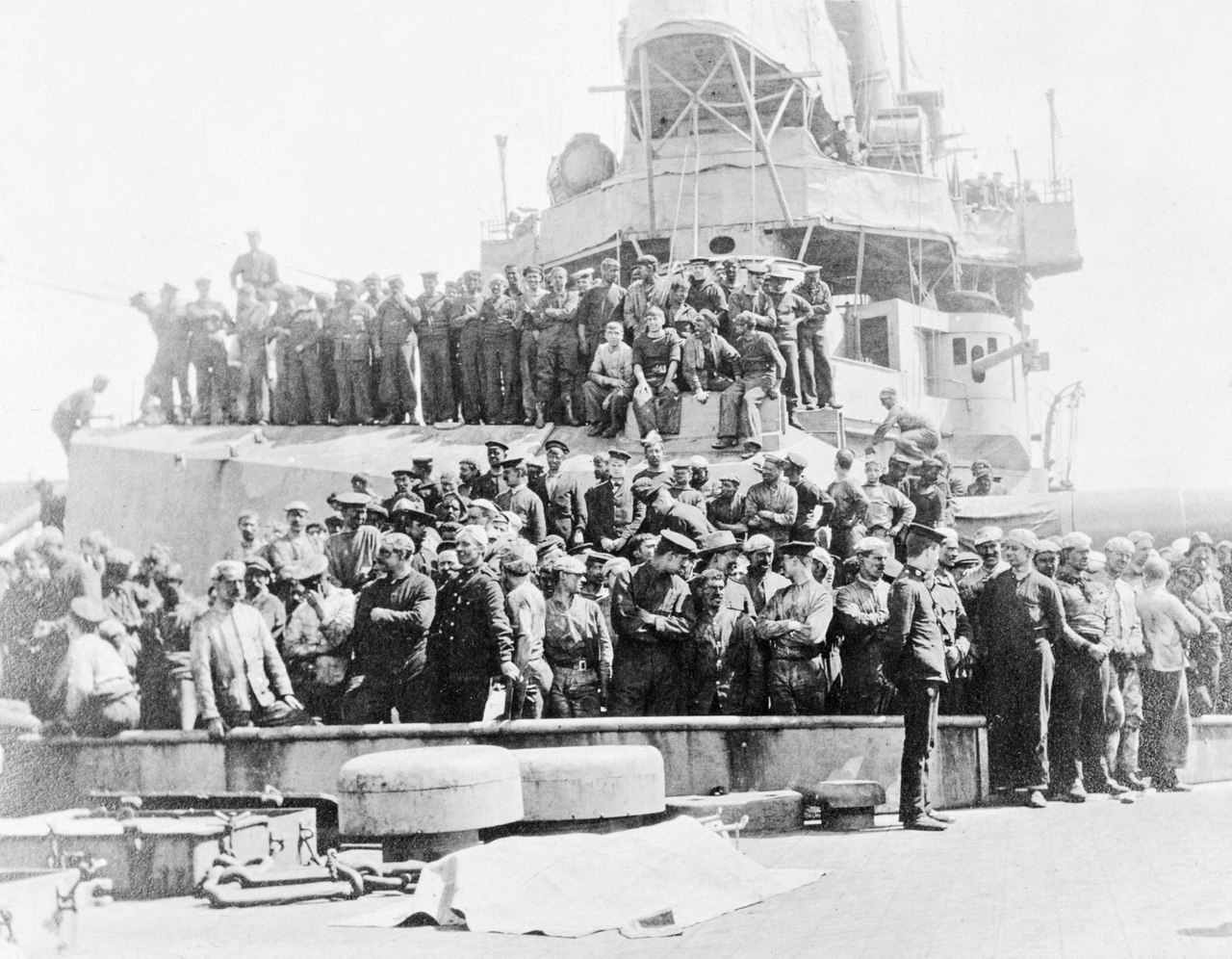 But the main action was between the big ships, both of which turned to the east around 1330, falling into parallel courses. Spee opened fire at about this point, and his gunnery was as good as ever, landing a hit on Invincible’s belt 15 minutes later. Sturdee opened the range slightly and began to hit back, landing three hits on Gneisenau and an unknown number on Scharnhorst in the next 15 minutes, before the guns fell silent and both forces turned south again. It took until 1448 for the British to bring Spee within range again, although this time Spee decided to try to bring them within range of his 5.9" secondary guns, closing to 10,000 yards by 1500. Both sides were hitting regularly, but the heavier shells of the battlecruisers were beginning to tell. Scharnhorst’s fire had turned ragged, and within half an hour they were down to 18 knots and Gneisenau was listing so much her secondary guns had fallen silent. By 1600, Scharnhorst was clearly doomed, and after signalling to her sister ship to keep running, she turned to try and delay the British. But even as late-arriving Carnaravon entered the action, the German cruiser slipped beneath the waves, taking every man aboard with her. It took another two hours to bring Gneisenau to heel, as fading light and drizzle conspired to shield her from British gunnery. Her crew fought to the very end, finally setting the scuttling charges when the end was inevitable and giving three cheers for the Kaiser as they abandoned ship. The British cruisers, now freed of other concerns, were able to pluck 177 survivors from the sea.