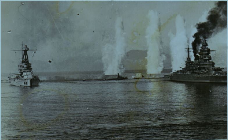 But that only took care of a small portion of the French fleet. The biggest remaining concentration was at Mers-el-Kebir, near Oran in Algeria, including the modern battleships Dunkerque and Strasbourg and the older Bretagne and Provence. They had initially been stationed there to defend the western Mediterranean against Italy, but now proved a tempting target for Churchill. To deal with them, he dispatched Admiral James Somerville with Force H, out of Gibraltar. Somerville had battlecruiser Hood, battleships Valiant and Resolution and carrier Ark Royal under his command, and on the morning of July 3rd, his representative delivered an ultimatum to the French. Either they would rejoin the Allies, be interned in British hands, be disarmed in the French West Indies, or be turned over to the US for safekeeping. If one of these wasn't selected within 6 hours, Somerville would open fire. The French commander, Admiral Gensoul ordered his ships to raise steam and clear for action while he played for time. Somerville was stuck aboard his flagship, and Gensoul refused to negotiate directly with the British representative, sending his own subordinates to do the job. This prolonged negotiations, as British planes flew overhead and Gensoul tried to get in touch with Admiral Darlan. Darlan couldn't be reached, and ultimately, at 1755, the British opened fire. Gensoul ordered his ships to get underway.