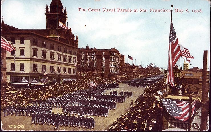 Finally, on April 14th, 1908, the fleet anchored off San Diego, four months after their departure from Virginia. They were met with an enthusiastic welcome. Four days later, the fleet departed for San Pedro and saw that every vantage point along the coast was crowded with Californians eager to get a look at the fleet. Los Angeles gave an even warmer welcome than San Diego, with people camping on the beach overnight because the traffic going home was so bad.9 Calls at Santa Barbara, Monterey and Santa Cruz saw similar receptions, before the fleet anchored in San Francisco Bay on May 5th.