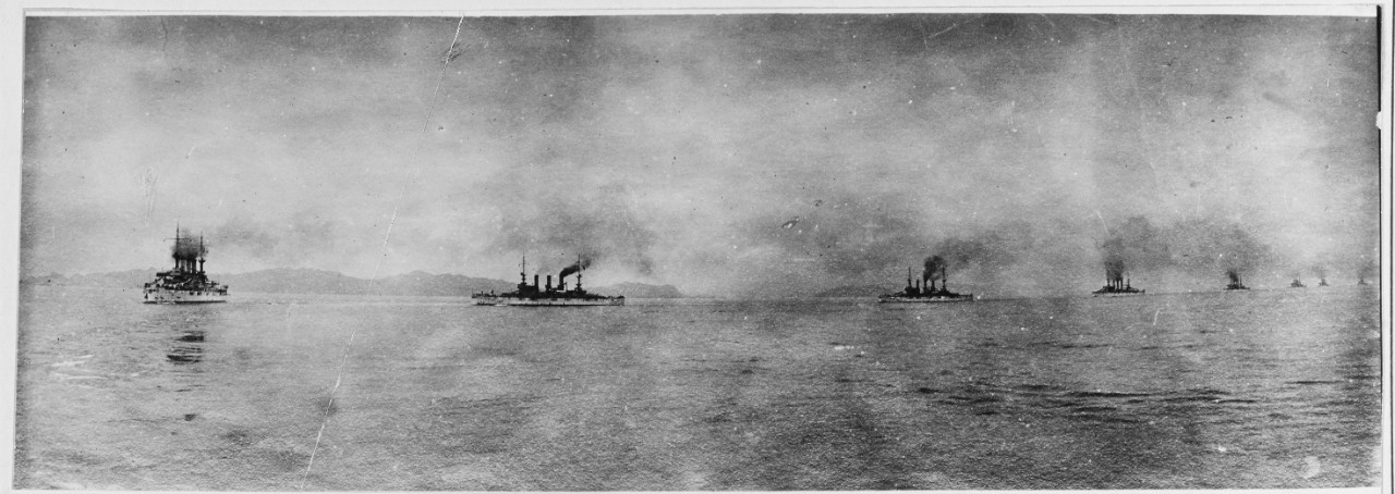 On December 16th, 1907, sixteen battleships2 departed US waters, bound first for Trinidad. The coal-burning fleet consumed 1,500 tons each day, providing a serious challenge for the Navy Department. 30 foreign colliers were chartered to supplement the eight naval vessels available after no US company bid for the contract on the first leg of the journey. The ships themselves, in a long line, were painted a brilliant peacetime white, quickly giving the force the name Great White Fleet.3
