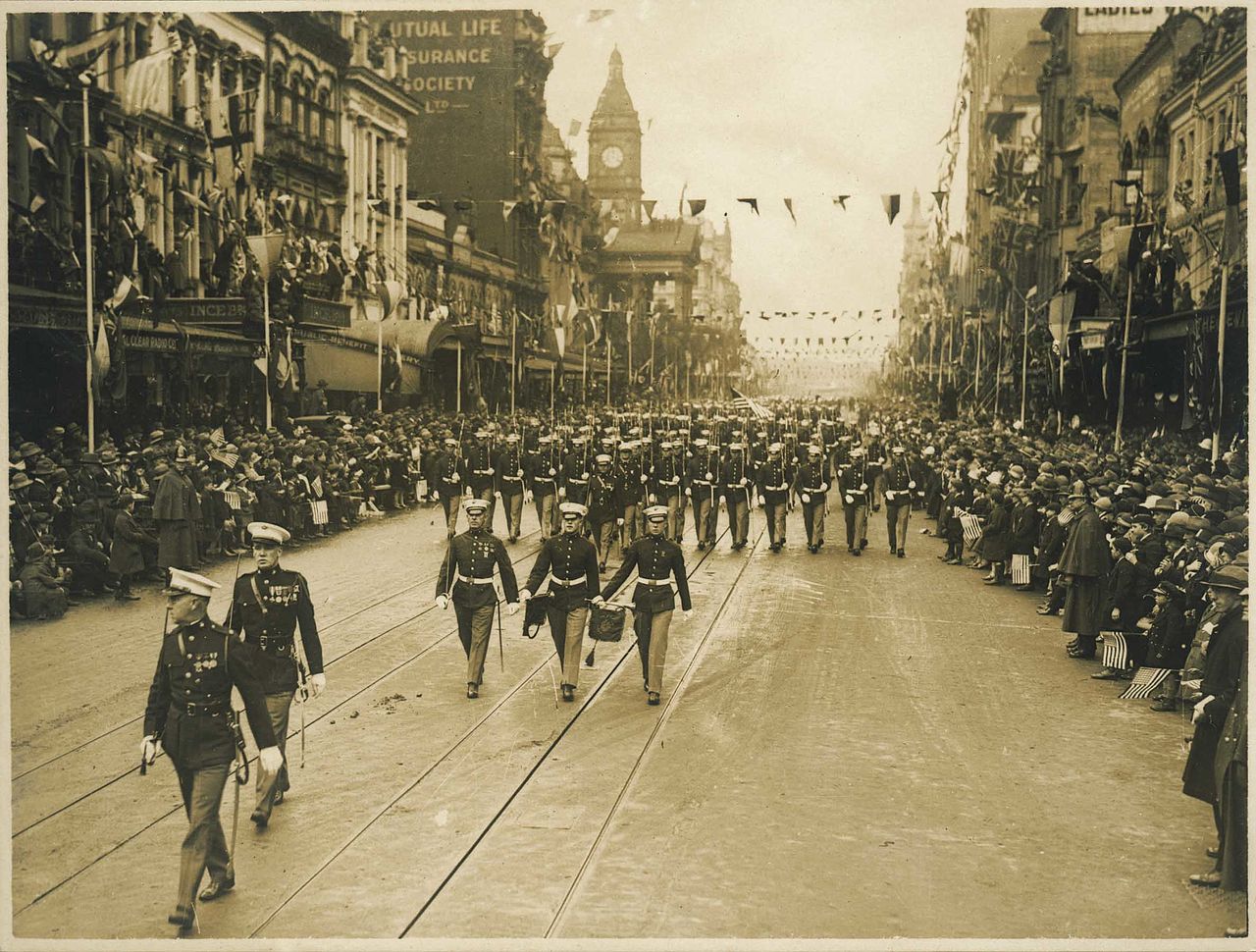 Melbourne gave its best welcome, although by this point the men of the fleet had become rather jaded, and barely noticed the cheering crowds and boats of spectators buzzing around. It took at least an hour and a half for the men to reach the city from the ships, but the visit was well worth it for most men. The pre-planned activities suffered from extremely low attendance. One dinner laid on for 3,000 men had exactly one show up on time, rising to seven over the next two hours. This was in many ways a measure of the success of the visit, which was acclaimed by the men as the best port call of the voyage. It was reportedly rare to see a girl who had managed to get a sailor all to herself, with most bluejackets seen in public having one on each arm. Not surprisingly, an epidemic of men overstaying their liberties broke out. Even though the battleship Kansas stayed behind for five days to retrieve stragglers, as well as picking up mail and conducting an investigation into a collision between an American collier and an Australian steamer, over 100 men were left behind in Melbourne, as opposed to only 15 in Sydney, and fewer in other ports the fleet called at.
