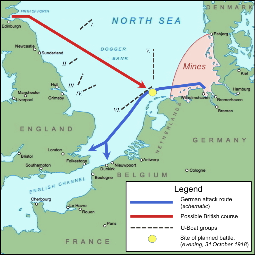 On the surface, the plan was fairly similar to those behind previous sorties into the North Sea. The High Seas Fleet would steam into the southern North Sea, an area known as the Hoofden, and its light cruisers and destroyers would raid the Belgian coast and the Thames Estuary on the morning of October 31st. The Grand Fleet would sortie in response, and on its way south, it would have to pass through newly-laid minefields and several lines of U-boats. The resulting attrition would weaken the Grand Fleet before its clash with the High Seas Fleet that night or the next morning.