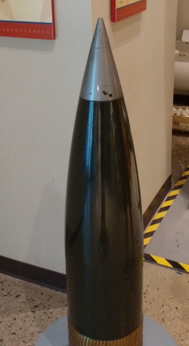 The Katie has its origins in the Mk 9, the world's first artillery-fired atomic projectile (AFAP). The Mk 9 was the Army's first nuclear weapon, part of its bid to keep itself relevant in an era when atomic weapons were expected to dominate the battlefield of the future.3 The designers faced serious challenges. An artillery shell is an incredibly difficult environment to put a complicated device like a nuclear warhead. It must withstand normal handling, thousands of Gs of acceleration as it's fired, and the centrifuge of a shell spinning at 10,000 rpm or more. It must be incredibly reliable, as a nuclear shell that doesn't go off is not only a waste of money but might give the target valuable materials or insight. And it needs to be compact, as big artillery pieces are heavy, expensive, and difficult to move. Ideally, a nuclear shell would be for an existing weapon, probably the 240 mm M1 howitzer, the biggest gun in the Army's inventory.