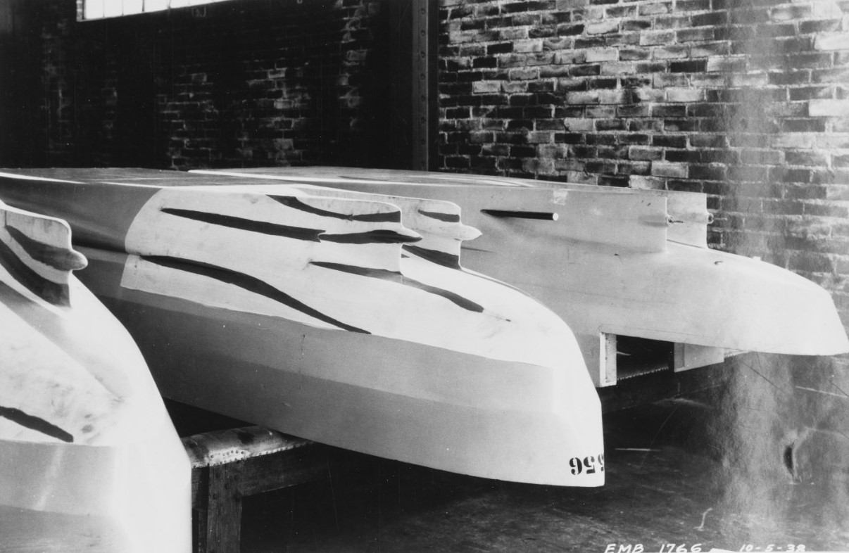 Models of potential hull forms for North Carolina, showing the twin-skeg hull form