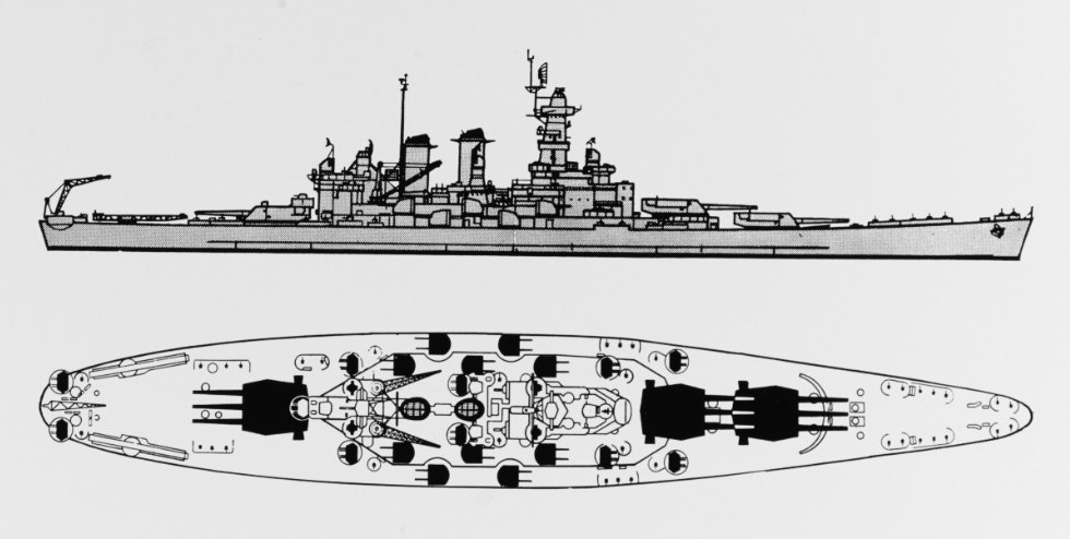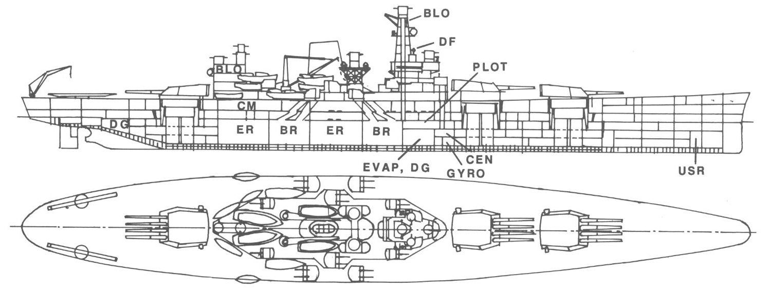 A few more tweaks were made before the ships were laid down. The belt was thickened to 12", making the inner edge of the immune zone 20,000 yards, and the slope increased to 15°. Turret 2 was raised enough to allow it to fire over Turret 1, which also allowed the turrets to be moved closer together. The secondary armament, originally 6 twin and 4 single 5"/38 mounts, was upgraded to 10 twin mounts. The light AA battery was planned to be 18 .50 cal machine guns and four quad 1.1" machine cannons.