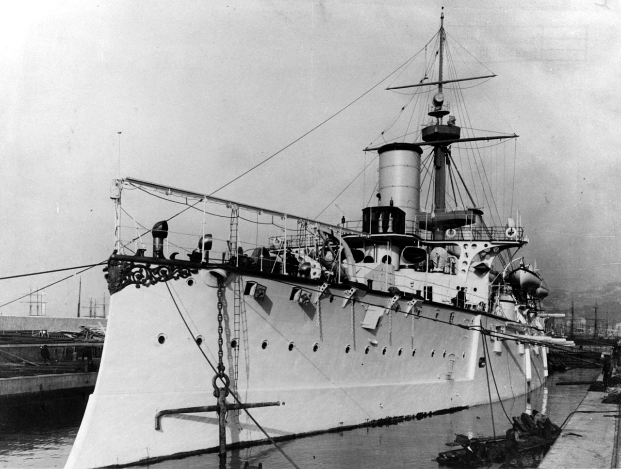This began to change in the early 1890s, as raiders began to shrink and the development of better armor allowed effective protection against QF guns. Two powers were quick to take advantage of this, both relative outsiders: the ubiquitous Italians and the rising United States. Italy got innovative in the face of a major fiscal crisis, designing armored cruisers of 6,840 tons which in theory had reasonable armor against QF guns and main batteries of 2 10" or 4 8" weapons, along with 6" QFs. These ships certainly looked impressive enough, producing immediate popularity on the export market. The lead ship, Giuseppe Garibaldi, was laid down in 1893, but sold to Argentina after her launch two years later, and replaced on the slip by another vessel of the same name, subsequently sold to Spain as Cristobal Colon. A third Garibaldi was also sold to Argentina, before the fourth finally entered Italian service in 1901, having been considerably stretched while under construction. Three other units of the class were built, one of which was also sold to Argentina, making the Garibaldi class one of the very rare cases where the majority of ships in a multi-ship class had the same name.