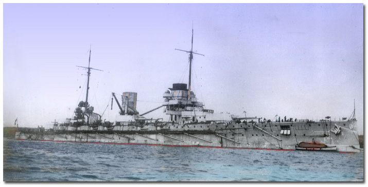 There was a short battle off Cape Sarych on November 18th, where Goeben engaged five Russian pre-dreadnoughts. The results were inconclusive, and Goeben took a hit which killed 13 men and damaged one of her secondary guns, while doing light damage to one of the Russian ships. Goeben struck two mines on December 26th, which was only partially repaired during the war, due to the absence of drydocks that would fit her. She bombarded Allied positions at Gallipoli, which brought her into brief contact with Allied battleships. May 10th saw another inconclusive encounter between Goeben and the Russian fleet, while the new Russian dreadnought Imperatritsa Ekaterina Velikaya engaged the ship on January 8th, 1916 with no results on either side. A coal shortage limited operations in 1917, until the armistice with the Russians late in the year.