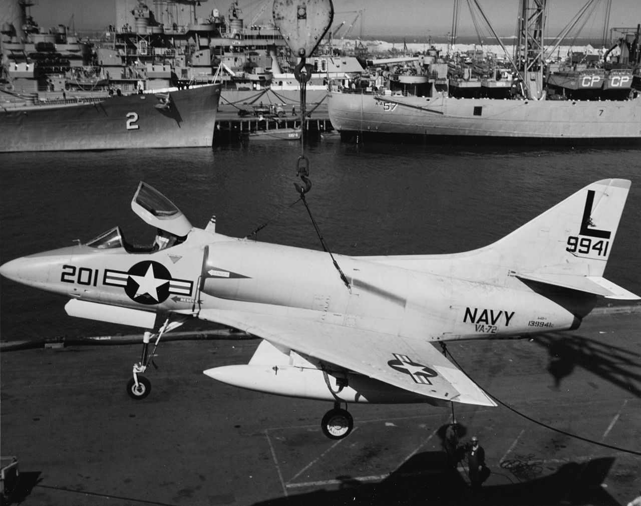 Even while being hoisted aboard, the A4D-1 Skyhawk retains its signature drop tanks.