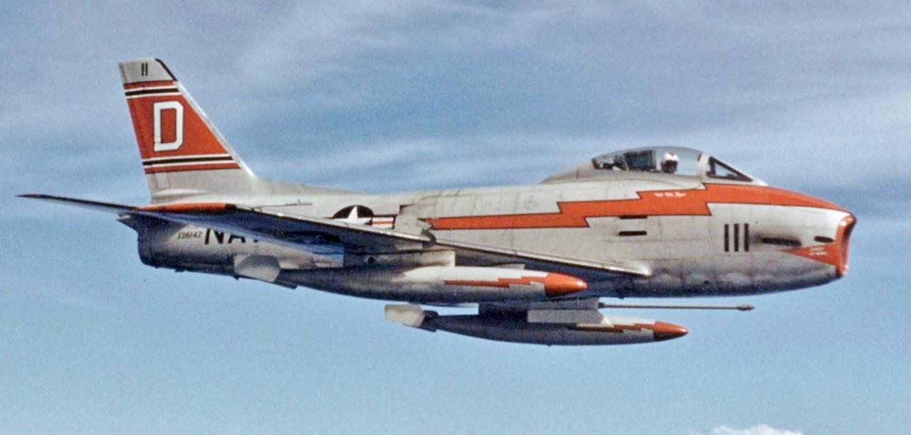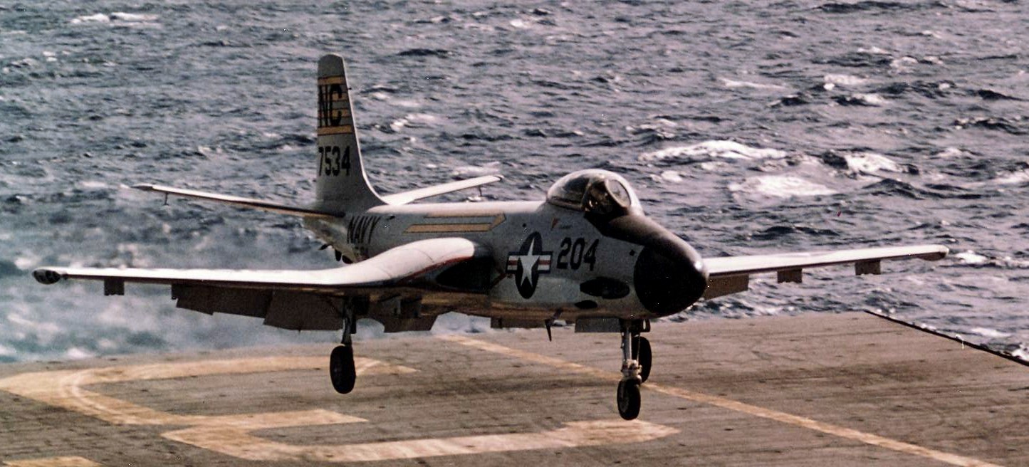 2 The Fury is unusual in that the FJ-1 was a straight-wing predecessor to the famous F-86 Saber, while the FJ-2, FJ-3 and FJ-4 were navalized derivatives of the F-86. Note that the later FJ-4 was nuclear-capable, but he didn't call that out, probably because it never deployed aboard Forrestal or her sisters.. ⇑