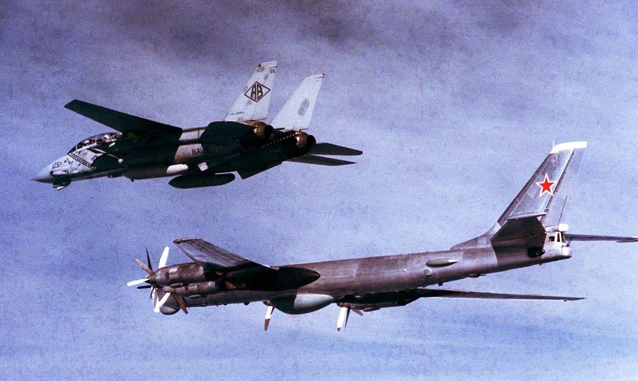 An F-14 escorts a Soviet Bear during Ocean Safari 85
