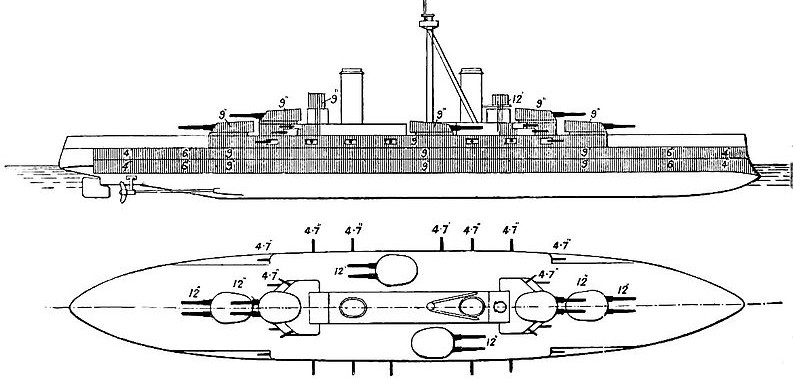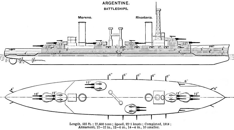 Argentina and Chile had responded to the Brazilian purchase by buying dreadnoughts of their own. Argentina bought a pair of ships, Rivadavia and Moreno, from the US. This was a shock, as the Latin American governments traditionally bought their arms from European suppliers.3 A US government loan, various diplomatic assurances and a promise to include the latest fire-control equipment secured the contract. Each ship was armed with 12 12" guns in twin turrets. Four were on the centerline, while the last two were in offset wing turrets, theoretically allowing a 12-gun broadside. Like all such arrangements, it didn't work particularly well.4