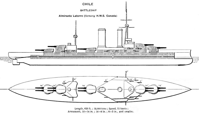 Chile bought two battleships from the British, Almirante Latorre7 and Almirante Cochrane, each armed with 10 14” guns. However, at the beginning of WWI, these ships were purchased by the British, with Chilean concurrence.8 Almirante Latorre was commissioned as HMS Canada in 1915, while Almirante Cochrane was converted to the carrier HMS Eagle, and commissioned in 1918. Canada participated in the Battle of Jutland, where she fired 42 rounds from her main guns, taking no hits. She was sold back to Chile in 1920, and regained her original name. Eagle remained in British service until sunk by a U-boat in the Mediterranean while covering a convoy to Malta.